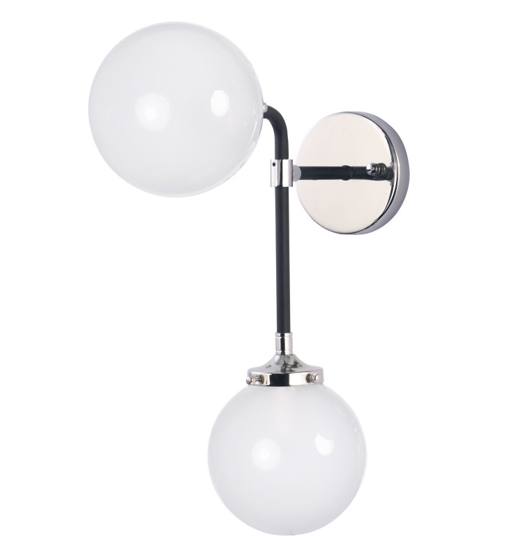 A Mid-Century Modern industrial classic revived featuring softly bent arms finished in Black with Polished Nickel accents that terminate at round White opal glass balls.