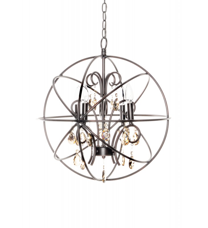 A spherical frame of metal surround a simple line chandelier draped in crystal for a transitional style that fits any interior design. Orbit is available in 2 sizes and 2 finishes, Oil Rubbed Bronze with Cognac crystal and a combo finish of Anthracite and Polished Nickel with Clear crystal.