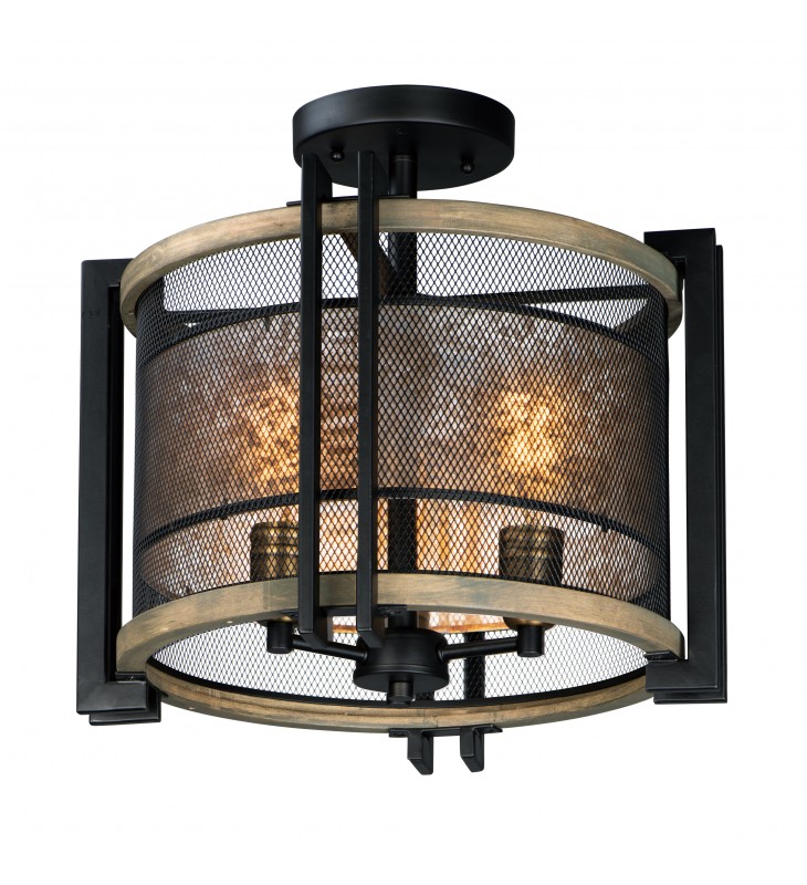 Frames of wood finished in Barn Wood and cradled by Black metal brackets were used to create this beautiful rustic design. The Black mesh screen is accented with a band of mica and Antique Brass sockets to deliver rustic charm with all the right fixings.