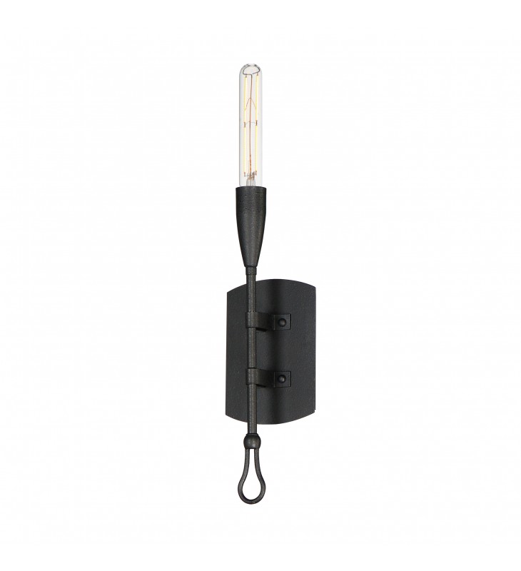 Simple with rustic elements, elongated rods are tiered with a forged iron hook and loop detail in multiple configurations. The fixtures\' textured Anthracite finish enhances the artistry of the forged iron construction. Available in multi-pendant configurations as well as a single pendant and sconce. Use tubular filament lamps to accentuate the verticality of the design.