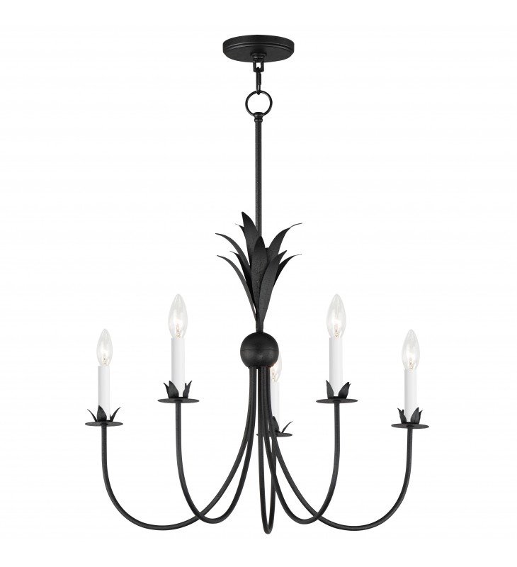 Effortlessly elegant, the biophilic design details that adorn this classic chandelier transport you to an oasis indoors. The design, whether brilliantly gilt in Gold Leaf or hand painted in a textured Anthracite finish, exudes a timeless quality that is sure to please. The graceful form of the chandeliers is constructed of slender metal tubes that sprout from a spherical collector at the center and Off-White metal candle covers. Coordinating Wall Sconces, Pendants and Flush Mount feature matching leaf clusters that allow for coordinating applications throughout the home.