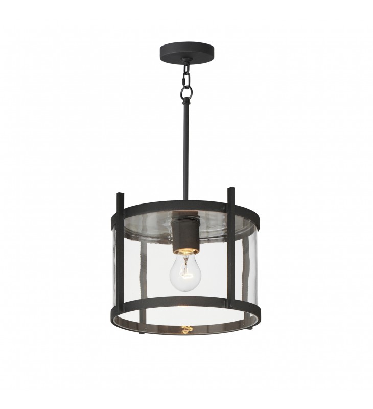 Squared columns in Matte Black finish tower above the cylindrical glass shade rated for outdoor applications. A rectangular hook detail carries the square form through to the backplate. A modern interpretation of a bell tower, these outdoor pendants and sconces are a cleaned up, transitional look for exteriors.