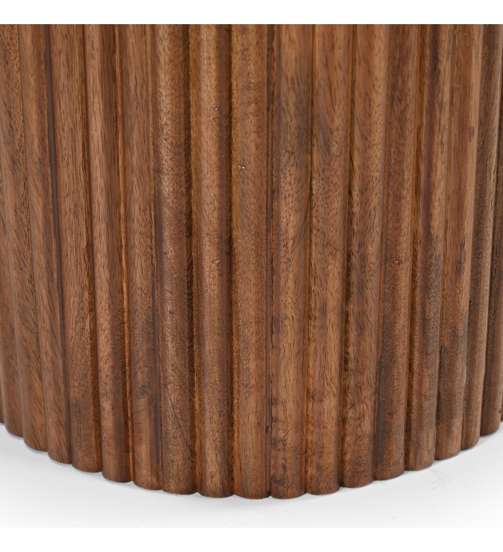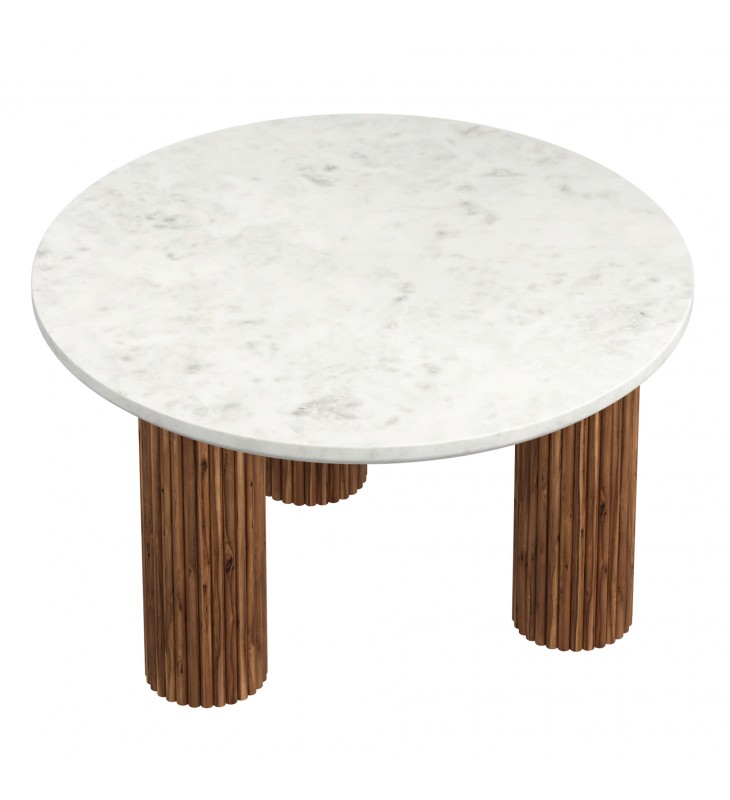 Mid-century modern round coffee table; Triple pedestal solid mango wood reeded base in a walnut finish; Thick, bevelled, white marble table top; Natural variations will occur in mango wood and marble slabs; Eco-friendly solid wood materials sourced from sustainable plantations