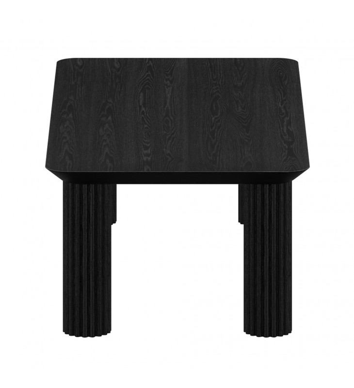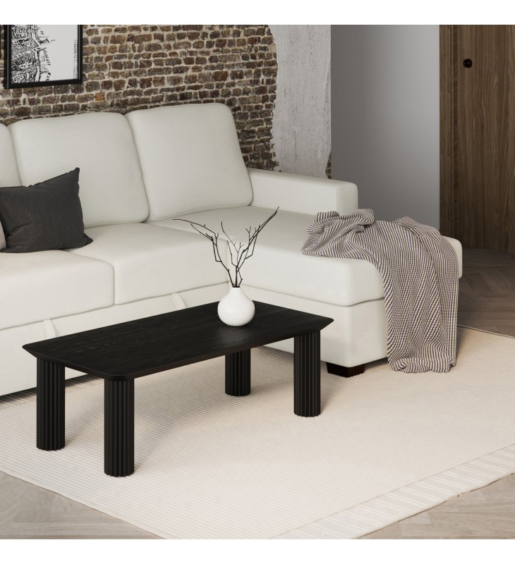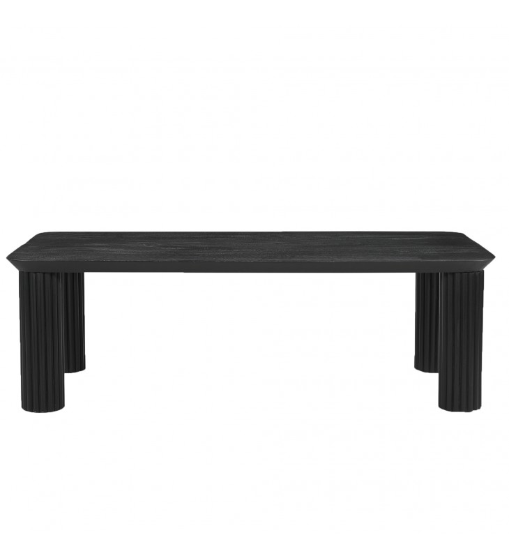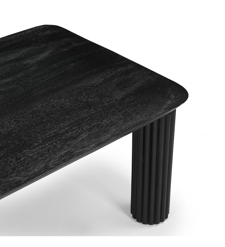 Modern, low-profile coffee table; 1-1/2\" thick reverse bevel table top; Solid mango wood with a black, wire-brushed finish on table top; Natural variations will occur in mango wood construction; Eco-friendly solid wood materials sourced from sustainable plantations