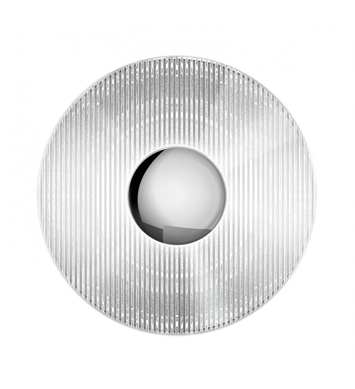 Circular medallions shield an LED illuminated core, reflecting dazzling illumination through the planes of a ribbed glass disc. Also available as a Pendant.