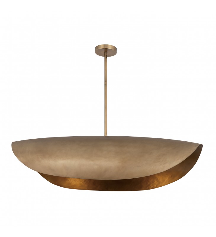 Large, cast metal shades evoke an ancient and timeless heritage. The light source is concealed within the shades casting a warm, ambient glow downward. Handcrafted and dramatically scaled, the rough texture is softened by its folding form in a multi-tonal Natural Gold finish. Select from various size pendants that coordinates well with the matching wall sconce.