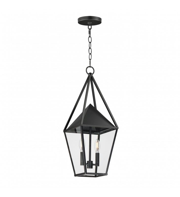 An exaggerated openwork framed steeple adds vertical qualities on a sharp-lined Matte Black lantern frame. Blending modern concepts with forms that evoke a whimsical imagery, this collection presents a transitional styling for outdoor spaces.