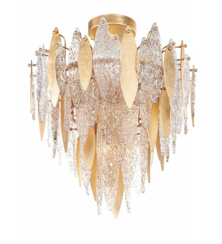 Hand-formed glass petals of Clear and Champagne-tint suspend from a tiered frame of gold and accented with petals of solid metal finished in Gold Leaf. Numerous candelabra sockets are strategically placed within the fixture to create glimmer and elegance to this majestic collection.