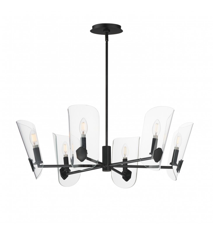 A Coat of Arms in curved Clear glass shades bevel cut and shaped to resemble traditional shields radiates off slender tubular arms. The streamlined design takes on a transitional approach with imaginative details that carries through to the concept for the wall sconce. Available 2 sizes of chandelier and a single light wall sconce in either Matte Black or Natural Aged Brass.