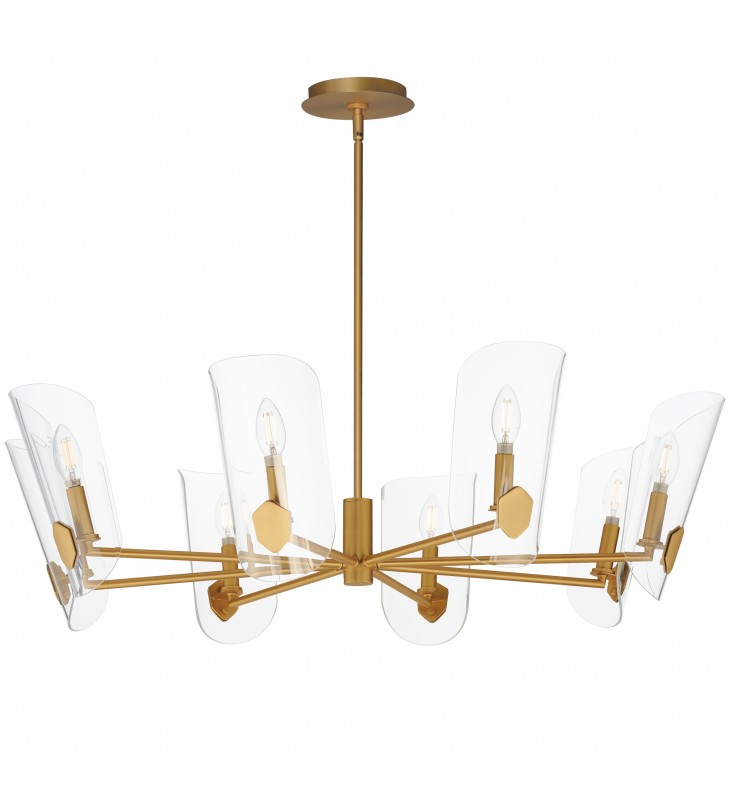 A Coat of Arms in curved Clear glass shades bevel cut and shaped to resemble traditional shields radiates off slender tubular arms. The streamlined design takes on a transitional approach with imaginative details that carries through to the concept for the wall sconce. Available 2 sizes of chandelier and a single light wall sconce in either Matte Black or Natural Aged Brass.