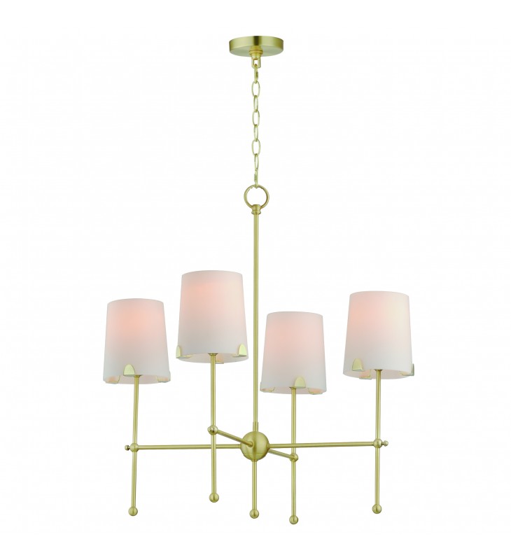 Satin White shades taper in a classic fabric shade shape and rest on elegantly thin frames of Satin Brass or Satin Nickel. They are supported secured by a mostly concealed structure with coordinating semicircular tabs that complement the spherical joints of the frame. The modern design details and updated shade materials refresh the outlook of a timeless chandelier though its use of thoughtful features.