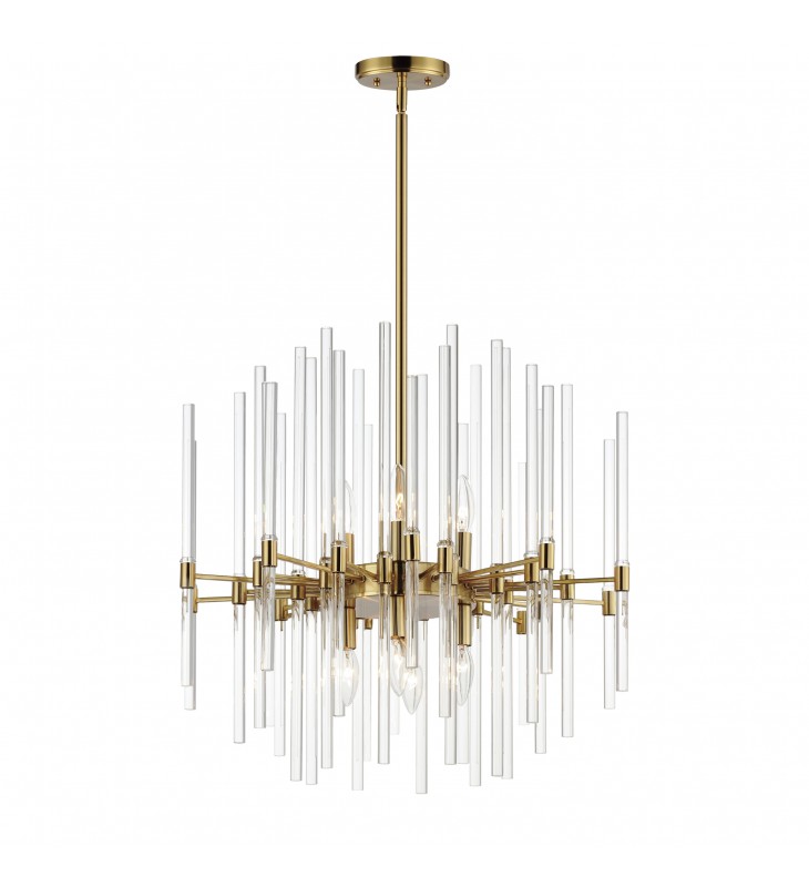 The composition of Clear glass rods are elegantly supported by thin radial arms of staggered lengths to create an iridescent motif that is truly Divine. Finished in Polished Nickel or Heritage Brass, the simplicity of this design delivers a crisp lighting fixture that works in a multitude of interior aesthetics from contemporary to traditional. Available in pendant, chandelier, and wall sconce configurations.