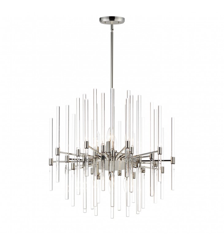 The composition of Clear glass rods are elegantly supported by thin radial arms of staggered lengths to create an iridescent motif that is truly Divine. Finished in Polished Nickel or Heritage Brass, the simplicity of this design delivers a crisp lighting fixture that works in a multitude of interior aesthetics from contemporary to traditional. Available in pendant, chandelier, and wall sconce configurations.