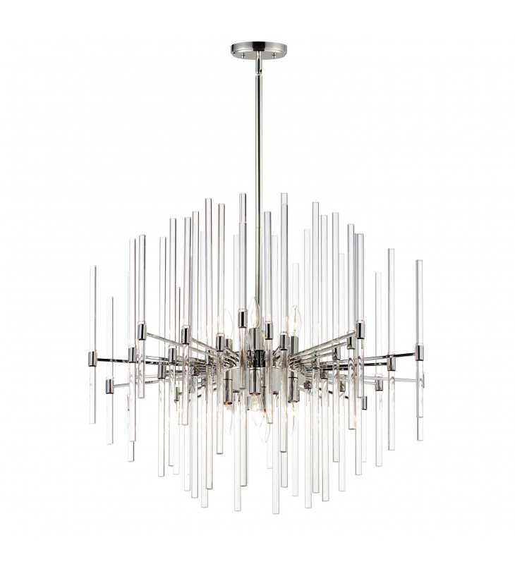 The composition of Clear glass rods are elegantly supported by thin radial arms of staggered lengths to create an iridescent motif that is truly Divine. Finished in Polished Nickel or Heritage Brass, the simplicity of this design delivers a crisp lighting fixture that works in a multitude of interior aesthetics from contemporary to traditional. Available in pendant, chandelier, and wall sconce configurations.