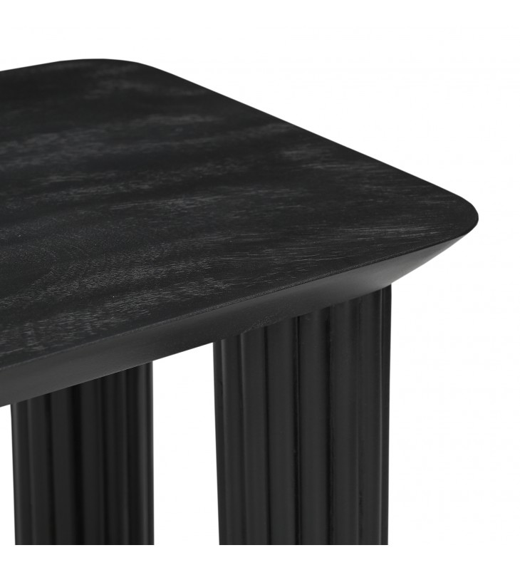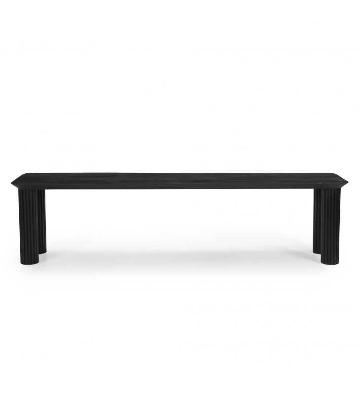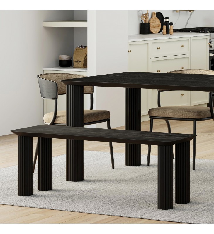 Modern 71\" dining bench; Four thick and sturdy legs with reed design; Solid mango wood with a black, wire-brushed finish on top; Natural variations will occur in mango wood construction; Approximate weight capacity is 600 lbs