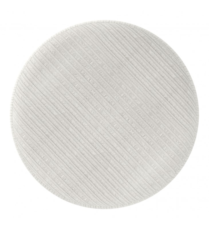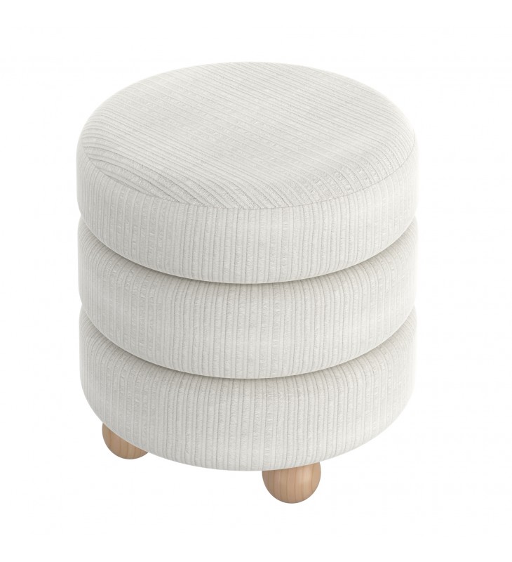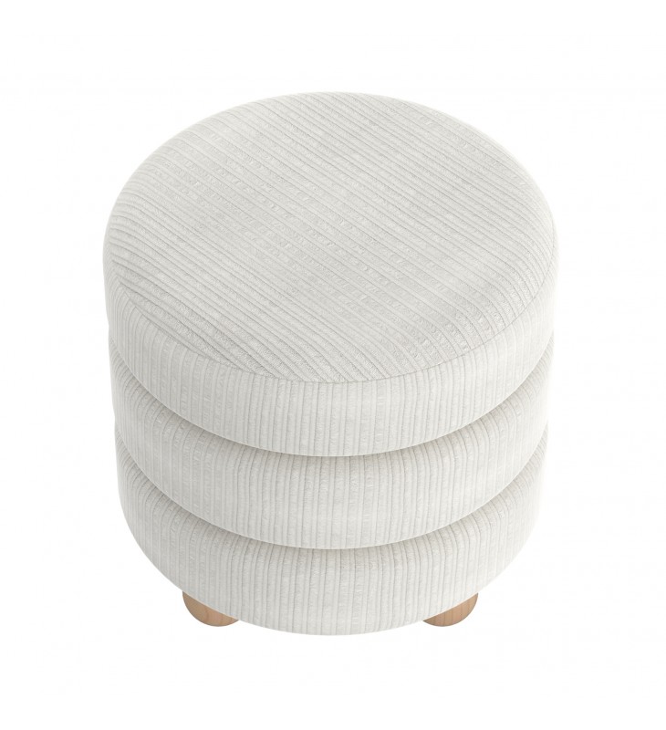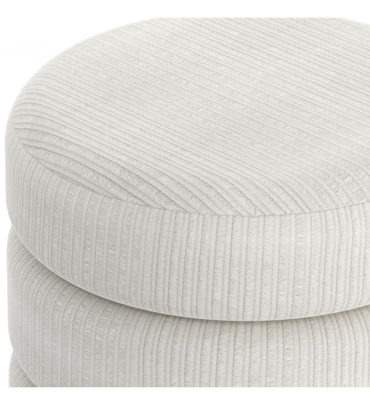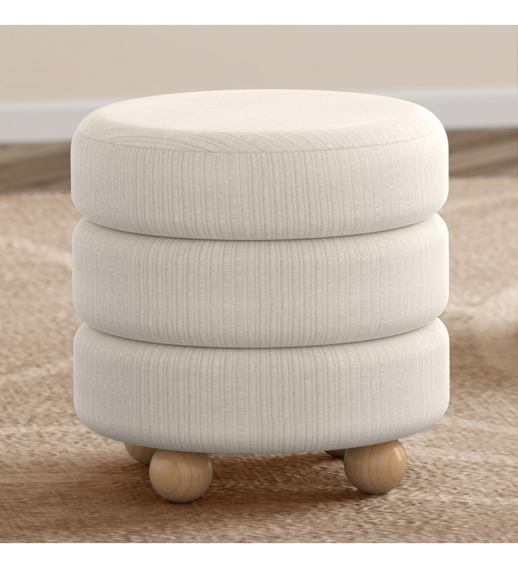 Modern round ottoman; Luxuriously soft and plush channelled fabric upholstery; Solid wood spherical feet in a natural wood finish; Medium comfort polyester foam cushion; Approximate weight capacity is 200 lbs