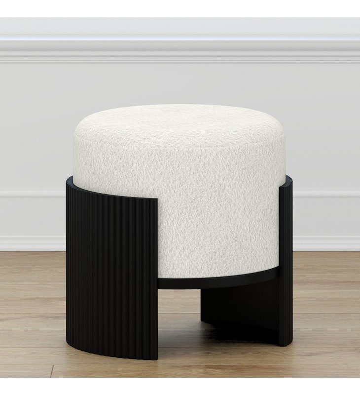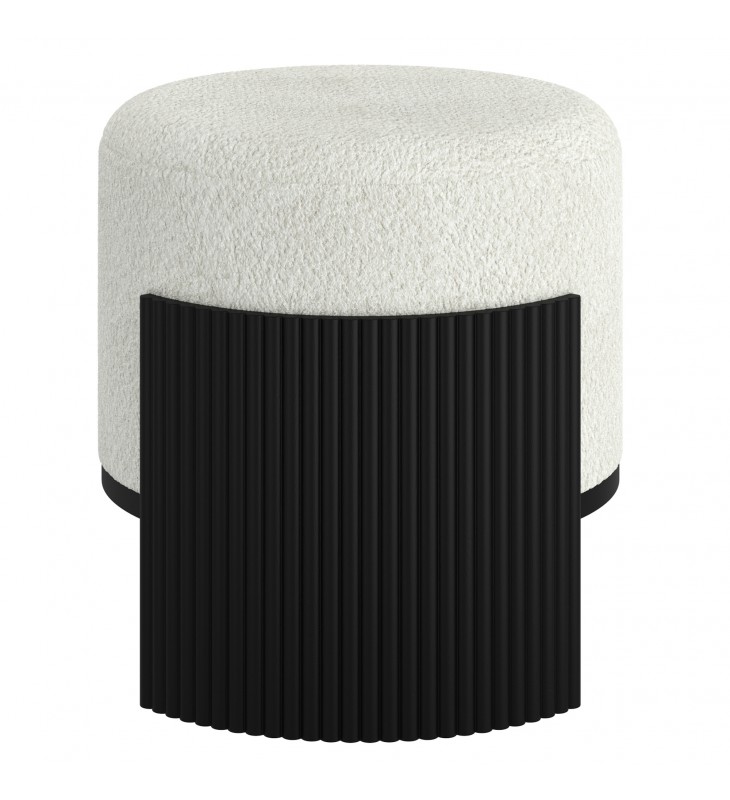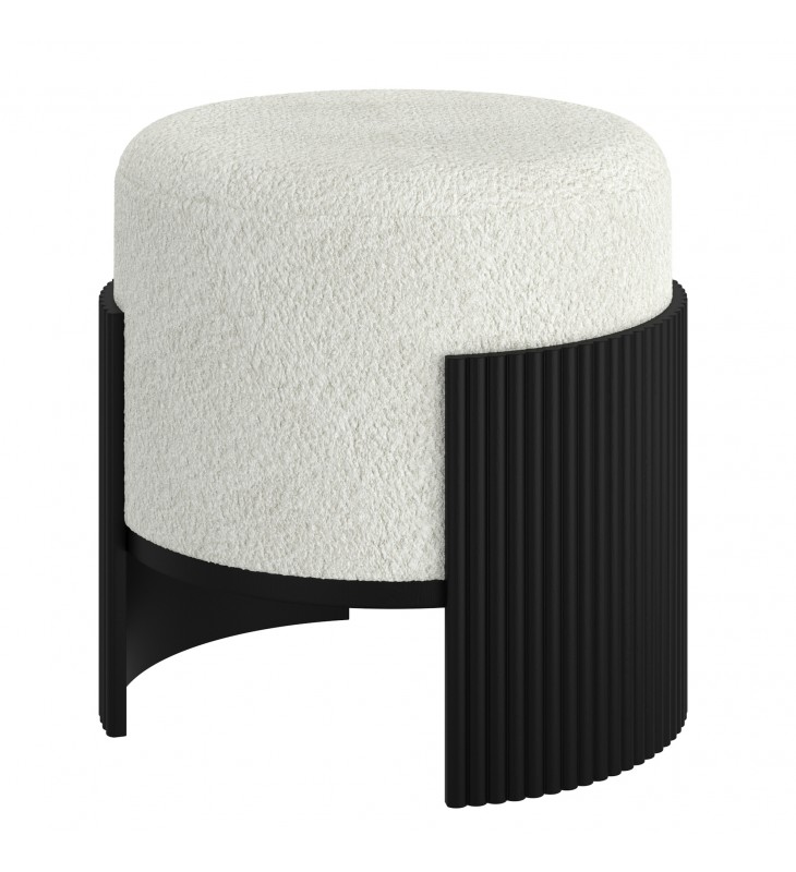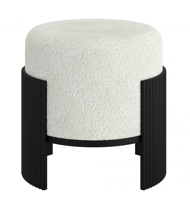 Modern fabric and wood ottoman; Soft, ivory boucle fabric upholstery; Reeded, engineered wood frame in a black finish; Medium-firm comfort polyester foam cushion; Approximate weight capacity is 200 lbs