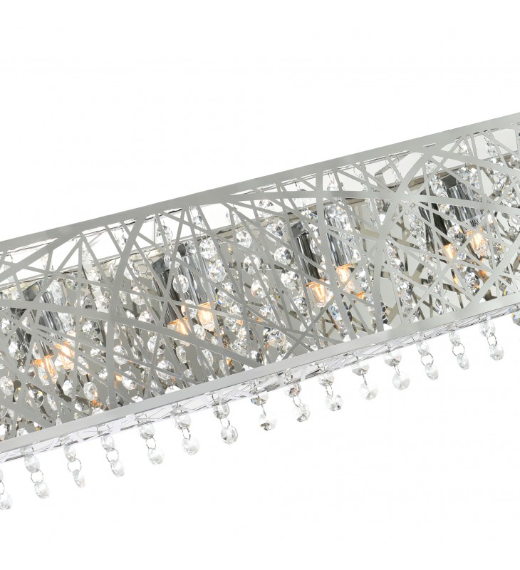 The Eternity 6 Light Wall Sconce is a dazzling modern sconce that will add tons of style and personality to your bathroom. It features a polished chrome shade with laser-cut pattern and strands of clear crystals dripping from the inside. With six G9 bi-pin bulbs that will provide ample lighting, this wall-mounted vanity light will bring a sophisticated touch to your master bath or halfway bath.