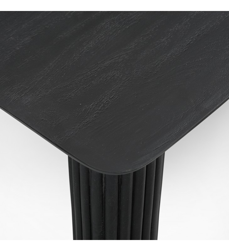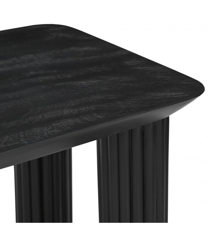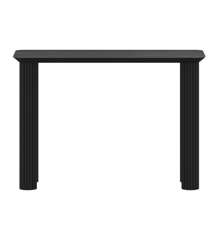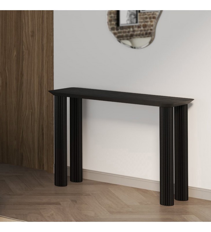 Modern 4-leg console table; 1-1/2\" thick reverse bevel table top; Solid mango wood with a black, wire-brushed finish on table top; Natural variations will occur in mango wood construction; Eco-friendly solid wood materials sourced from sustainable plantations