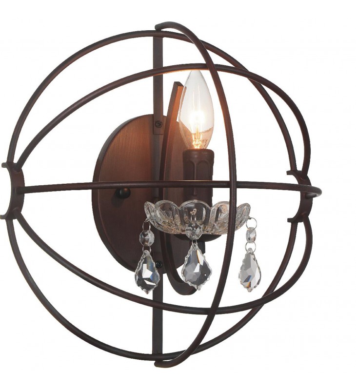 Revive a bath with the Campechia 1 Light Wall Sconce. This rustic wall light in brown finish is ready to give your home some rustic refinement. On a circular wall plate is a single metal arm holding a candelabra complete with decorative glass drip pan. Clear crystal beads in teardrop shape adds a hint of luxury and a touch of chic style to this wall-mounted light source. Completing the look is an open orb frame that allows light to shine through for that soft and perfect glow.