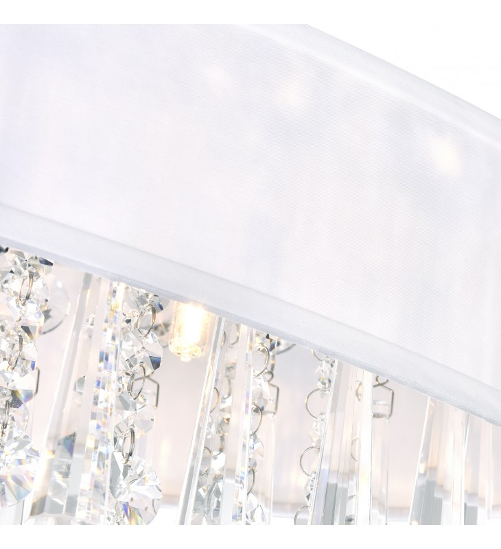 Boost the overall style of your space with the luxurious brilliance of Franca 4 Light Flush Mount. This light fixture provides plenty of sparkle with its conical glass tubes and clear crystal strands. The 16 inch circular drum shade is available in white and black, with the hardware finished in chrome.