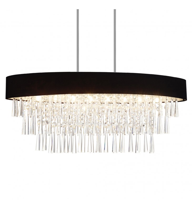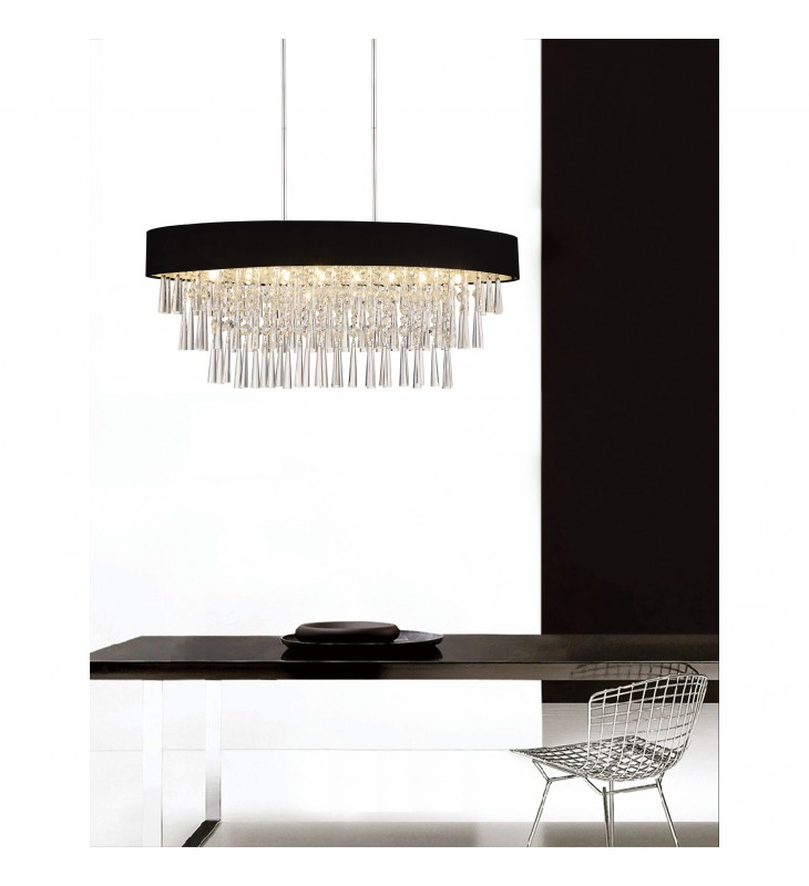 Add the Franca 8 Light Chandelier to your interiors and set pulses racing while flooding your space with brightness. This drum shade chandelier measures 38 inches wide and is ideal above a dining table or a kitchen island. The oval shade serves as the frame that holds and caps three tiers of cascading crystal tubes interspersed with strands of crystal beads. Available in white and in black shade, with chrome hardware, this oversized light fixture will provide your interiors with decorative and functional brilliance.