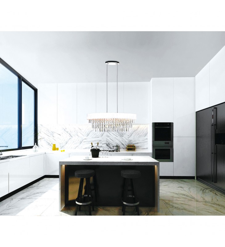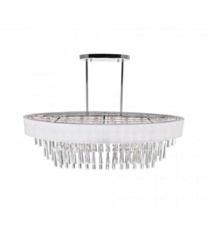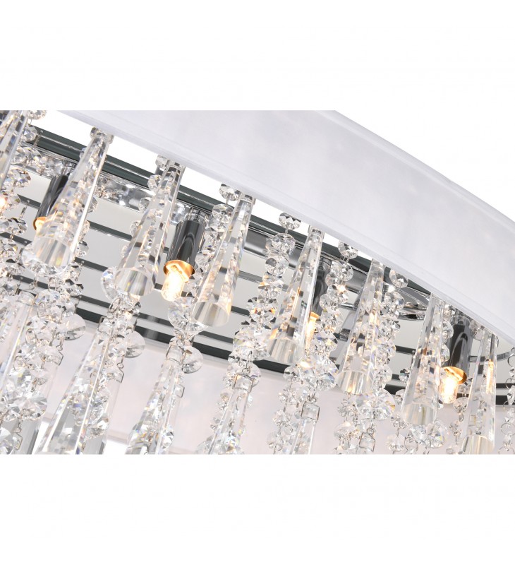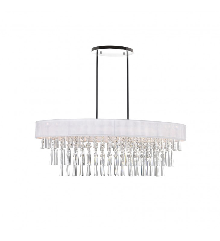 Add the Franca 8 Light Chandelier to your interiors and set pulses racing while flooding your space with brightness. This drum shade chandelier measures 38 inches wide and is ideal above a dining table or a kitchen island. The oval shade serves as the frame that holds and caps three tiers of cascading crystal tubes interspersed with strands of crystal beads. Available in white and in black shade, with chrome hardware, this oversized light fixture will provide your interiors with decorative and functional brilliance.