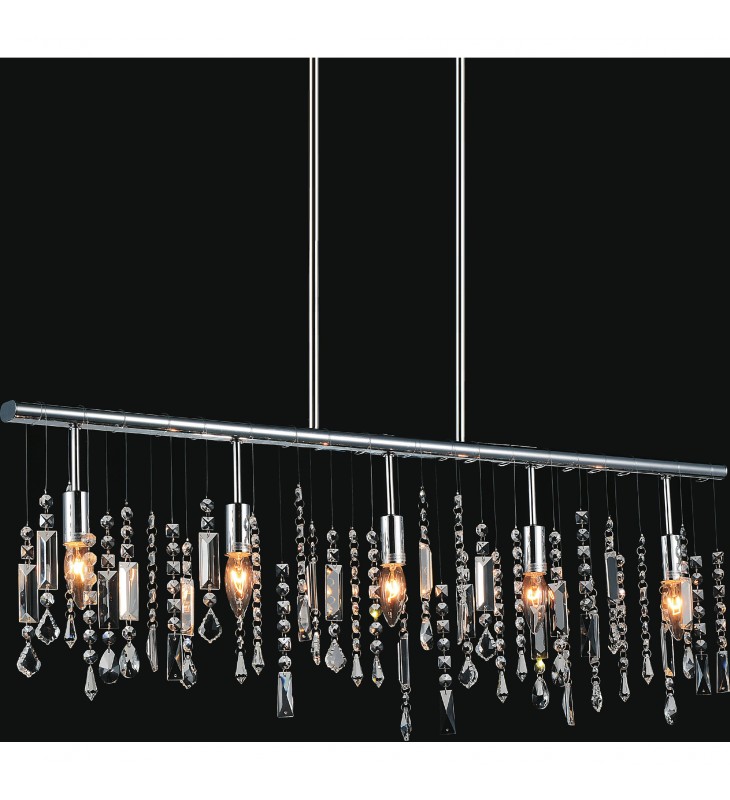 A sophisticated bling over your dining, the Janine 5 Light Chandelier will make your stylish room shine even more. This oversized linear light in chrome finish has a modernist edge one cannot overlook. The strands of clear crystals dangling over the table while candelabra bulbs cast light downwards will certainly make mealtimes a little more indulgent.