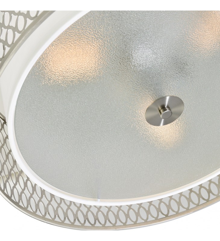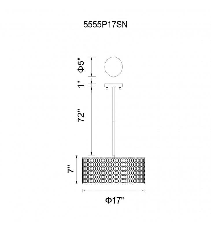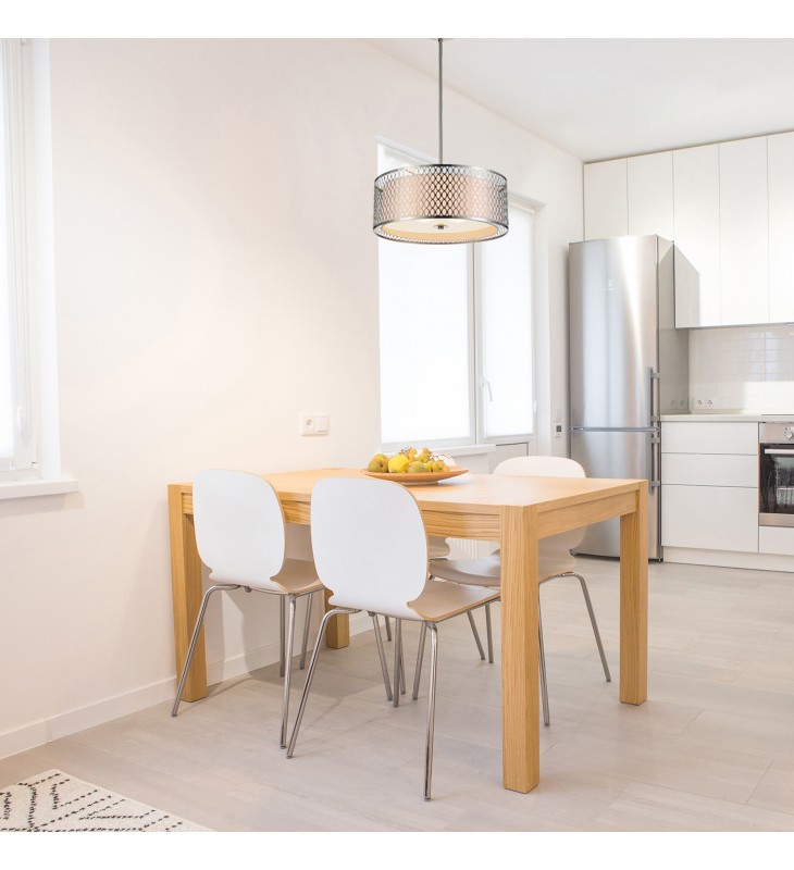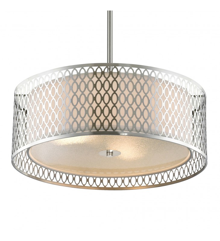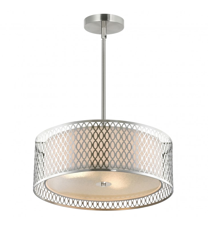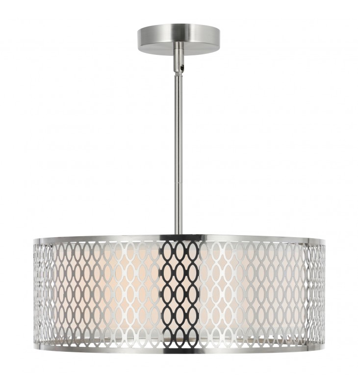 Add dimension and detail to a space with the Mikayla 3 Light Chandelier. This satin nickel light fixture is designed with a double drum shade with an outer metal drum measuring 17 inches in diameter. It features an open framework with circular lattice pattern. The inner shade is in solid off-white and diffuses light that is warm, soft, and guaranteed to delight.
