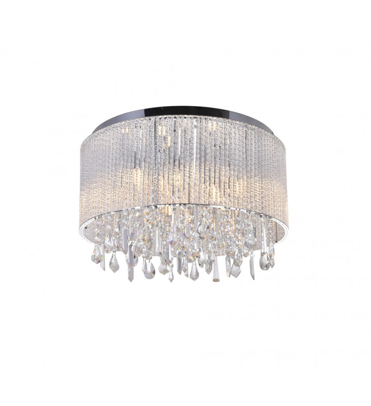Spoil your home today with the Benson 9 Light Flush Mount. On a chrome ceiling plate is a shade made-up of extra slender clear crystal tubes. Underneath are nine bulbs and dangling faceted crystals of varying shapes. Mounted close to the wall, this compact light source optimizes headspace while delivering necessary light. Replace that bland and boring light fixture today with this simple yet opulent crystal drum shade. \n