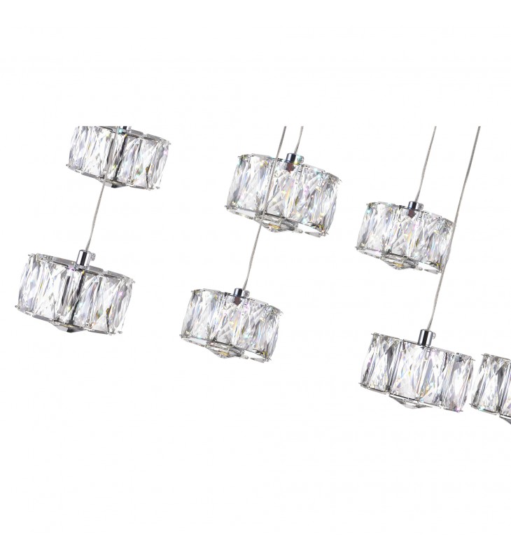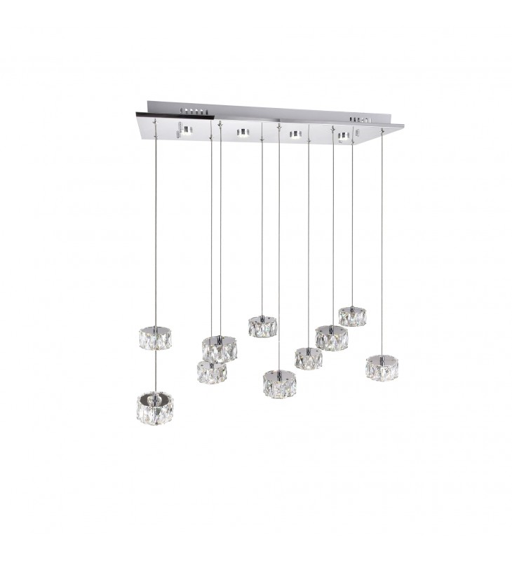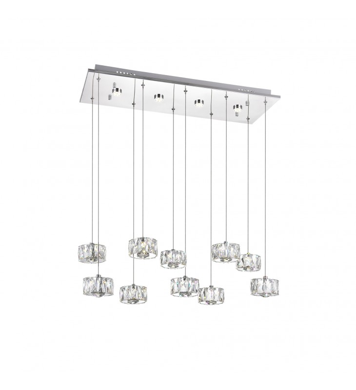 The Milan 10 Pendant LED Chandelier brings in elegance and glamour with its sleek yet delicate style. This large multi Light pendant is designed with a rectangular canopy in chrome holding ten glittering sources of light. Each pendant has its sides covered in faceted crystals. Built inch LEDs radiate a shimmering glow.