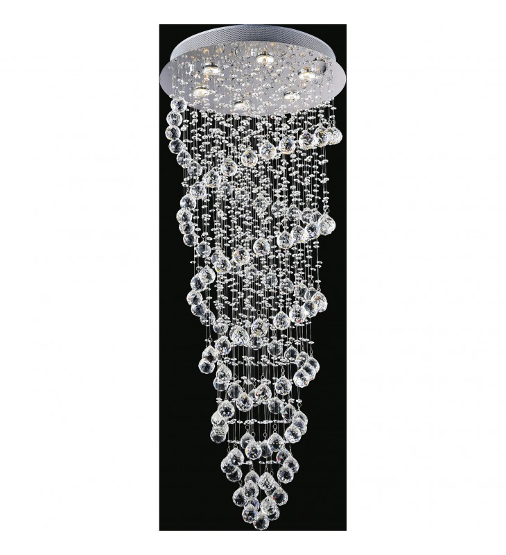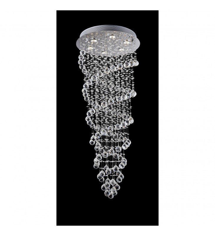 A lavish lighting that will easily add luxury to your home. Replace your outdated light fixture with the Double Spiral 6 Light Flush Mount Chandelier and take your lighting and decor up a couple of notches. With a 20 inch round canopy in chrome and a height measuring 47 inches, this chandelier will add a new level of class to any room. Its spiraling crystal silhouette will look absolutely gorgeous on the living room, the foyer, or in a stairwell.