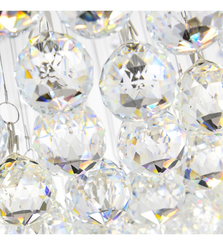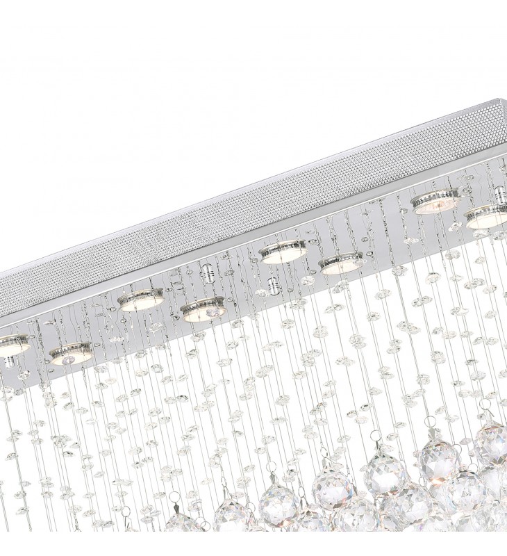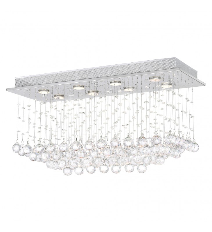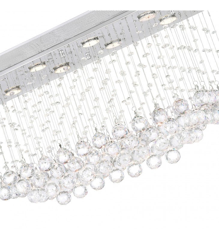 Keep it glam chic with the Twinkle 8 Light Flush Mount. This light fixture measures 32 inches wide and features a rectangular canopy in chrome. Dangling from it are strands of crystals embellished with a crystal ball on every end. This ceiling light offers an enchanting sparkle that will truly provide any space with a shimmering style. This flush mount light fixture is ideal for entryways, dining rooms, and kitchen islands.