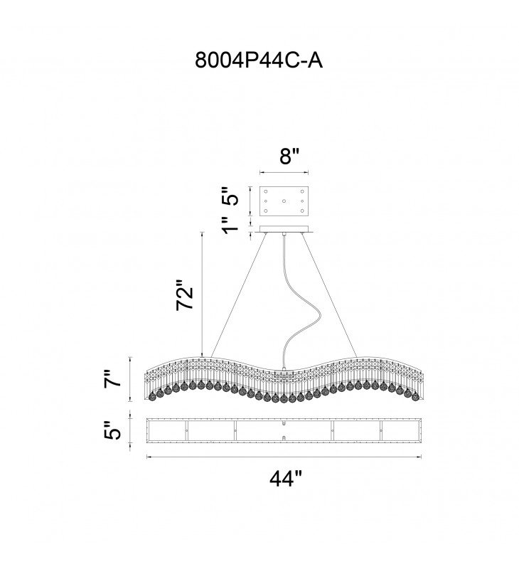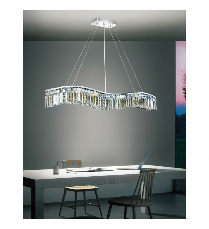 The Glamorous 7 Light Chandelier in Chrome is perfect for adding light and style above a rectangular dining room or kitchen island. This light source is designed as a linear suspension with a softer profile. The wavy silhouette complements the dangling crystal adornment. A chrome canopy with adjustable cords hold the wavy crystal shade securely.