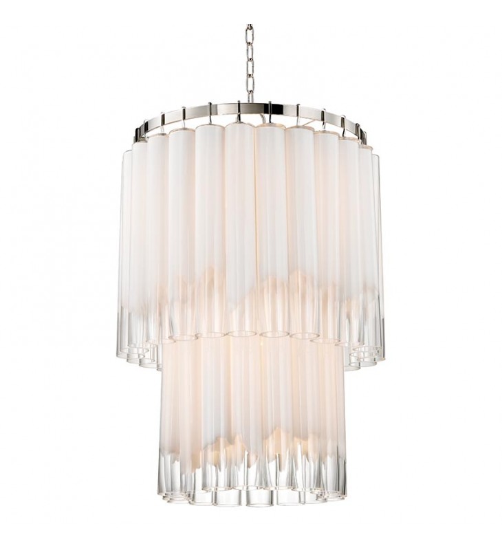 Each glass tube in our Tyrell family is purposely imperfect, frosted opal toward the top before raggedly giving way to perfect clarity by the base. Outer gloss gives them sheen, making for a mysterious and alluring diffusion effect as light comes blushing through from candelabra bulbs set perpendicular to each layer of glass tubes. Tyrell adds a 21st-century touch to a Modernist classic.