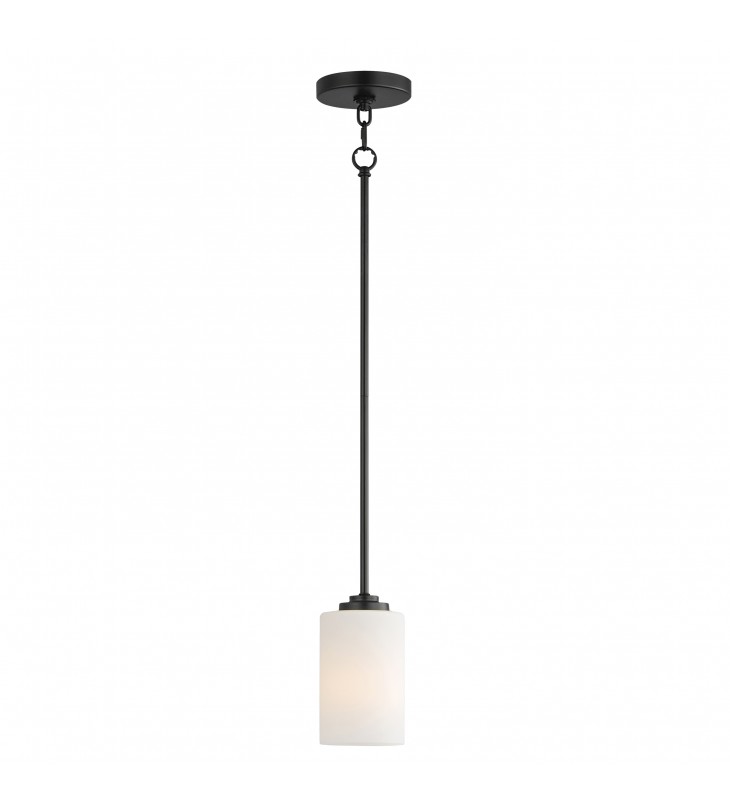 Low sloping arms of rectilinear tubing is finished in a variety of options that include Satin Nickel, Oil Rubbed Bronze, Matte Black, and a contemporary Satin Brass finish. Tall, cylindrical Satin White glass shades soften the light source within. Offered in a variety of configurations that include chandeliers, sconces, and a semi-flush pendant that may be used as a foyer pendant, has become a proven popular choice among builders.