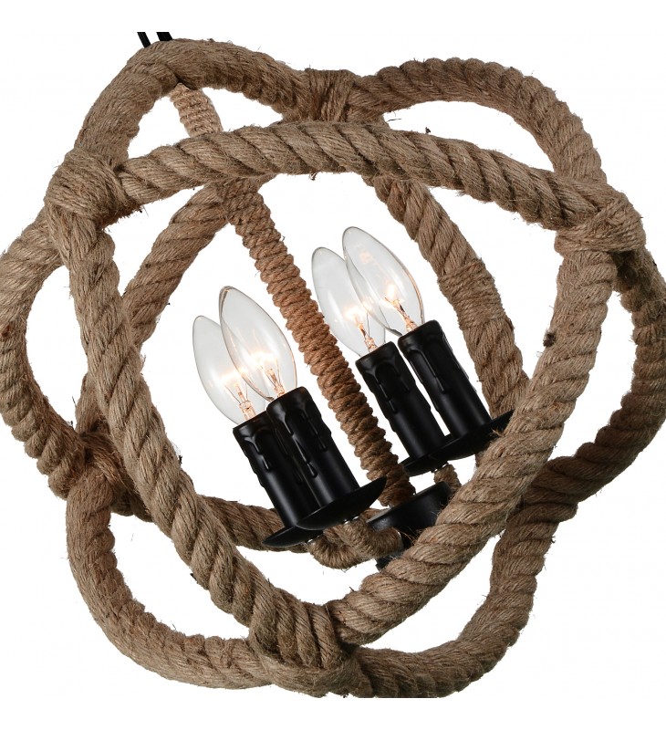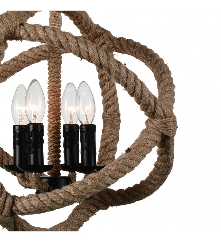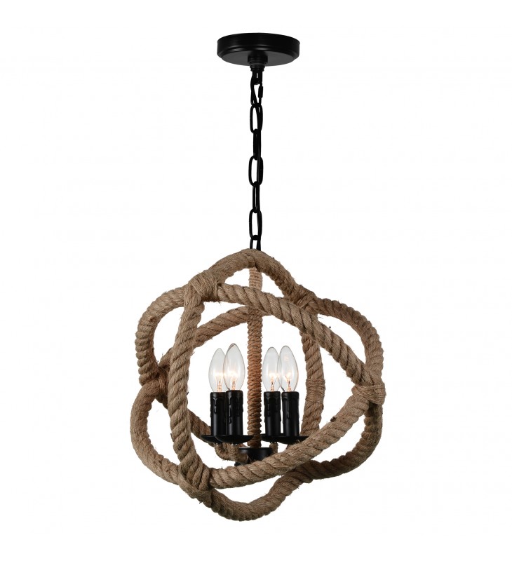 Create a more welcoming dining environment by replacing your light fixture with a pair of the Padma 4 Light Chandelier. This rustic light fixture is designed with a geometric pendant with hemp rope frame. A black candelabra base sits at the center holding four candelabra bulbs. This 15 inch pendant light displays a rugged, natural beauty perfect for bringing any space that cozy, earthy, and organic feel. \'