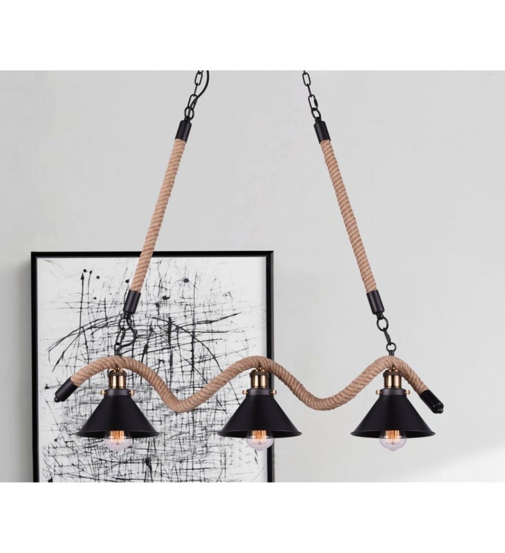 The oversized Padma 3 Light Chandelier has that layer of texture perfect for creating a rustic, homey, cabin-like space. This 34 inch up chandelier features three black cone shades held by a curved frame wrapped in hemp rope. The three-piece light source hangs from a chain and hemp rope cord that you can easily adjust. This light fixture is compatible with a dimmer.