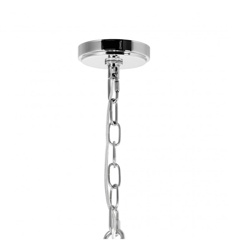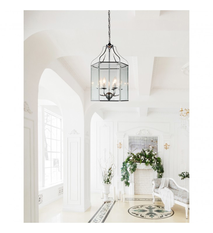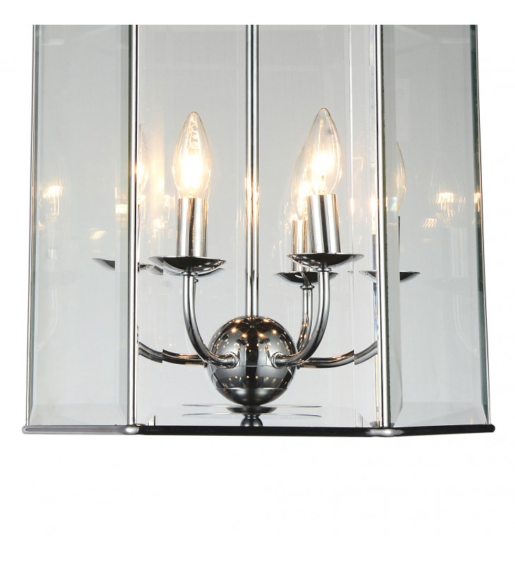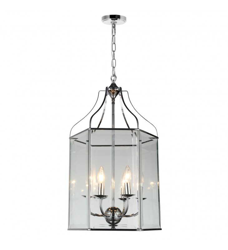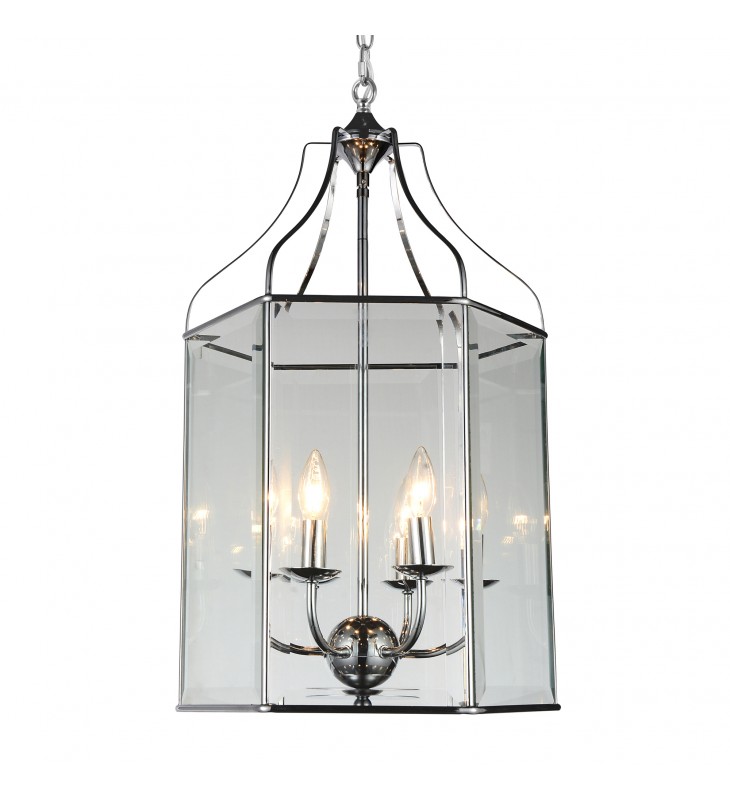 A modern lantern with magical beauty. The Maury 6 Light Chandelier features an elegant candelabra frame in chrome complete with drip plates. It is encased in a lantern-like shade with glass panels and chrome trims. This fixture looks simple yet chic and is perfect for enhancing the mood in a family room or a dining room.
