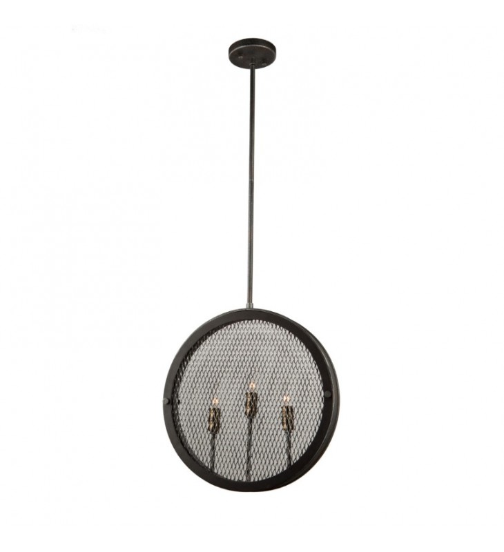 A textured slate outer body finish, metal mesh, and vintage brass candles makes the \"Riverside\" collection a trend setter. (comes with extra rods for desired height adjustment and hand straight for sloped ceilings)\n \n \n \n