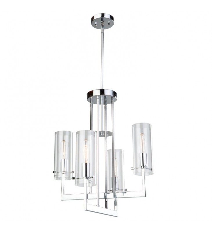 Plated in shiny chrome, with a cylindrical clear glass, the \"Brinkley\" four light chandelier is a great addition to any surrounding\n \n \n \n