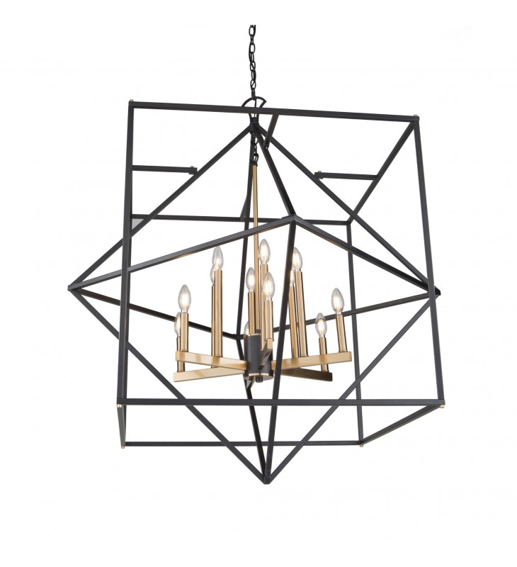 Linear in design, the Roxton collection is comprised of a matte black exterior cage which a diamond within a square that encases a harvest brass inner chandelier cluster. 12 light shown (smaller versions available)