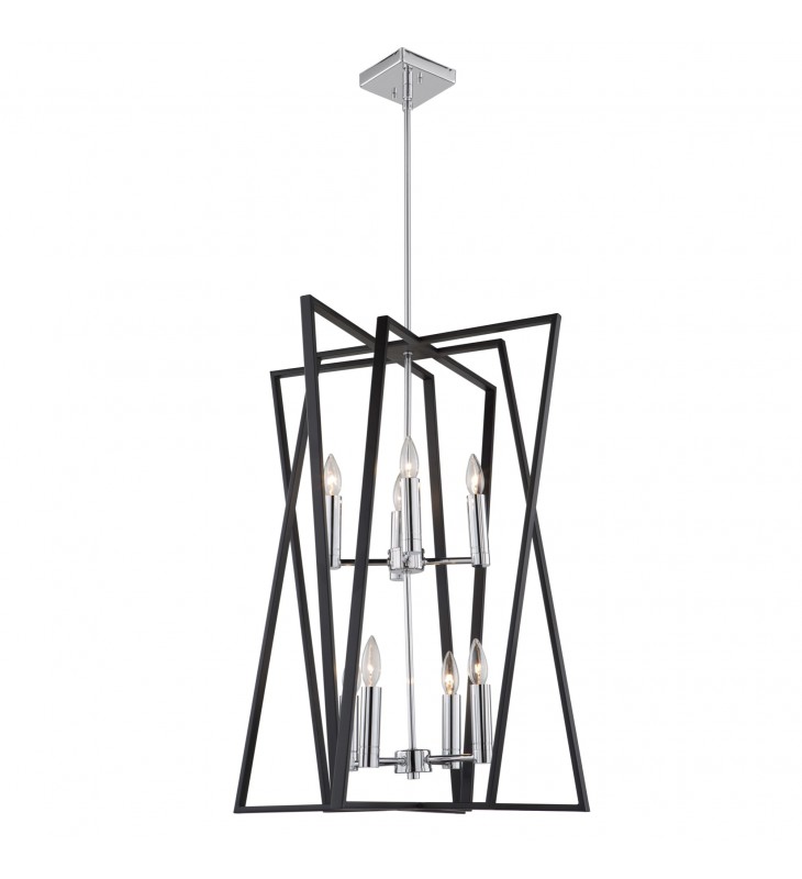 The Middleton collection features a matte black geometrically shaped frame which encases a plated polished chrome chandelier. 8 light candelabra foyer type chandelier shown (matching companion units available).\n\n