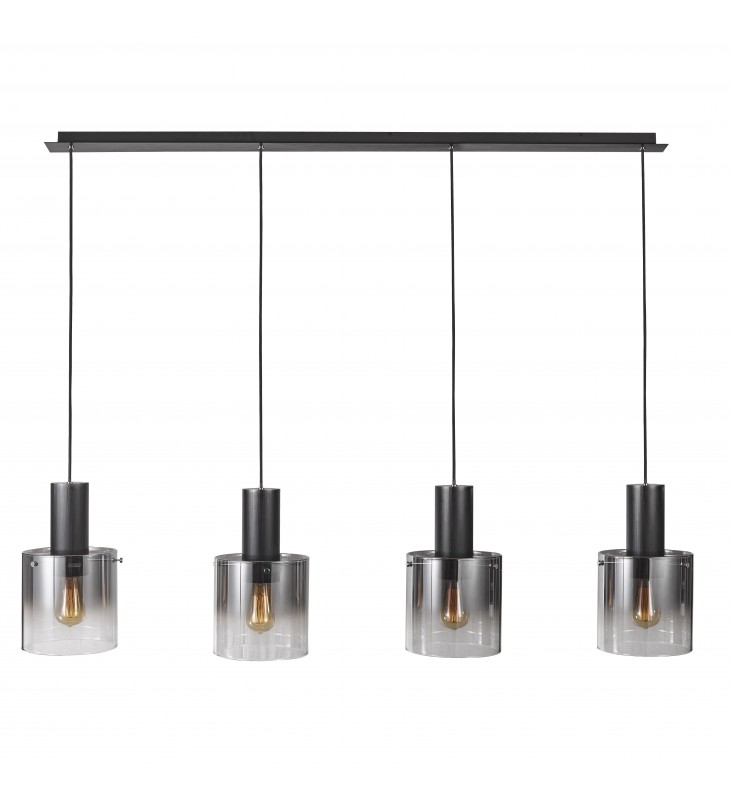 The \"Henley\" collection 4 light linear island chandelier features smoke type glassware, and black hardware suspended on wires.