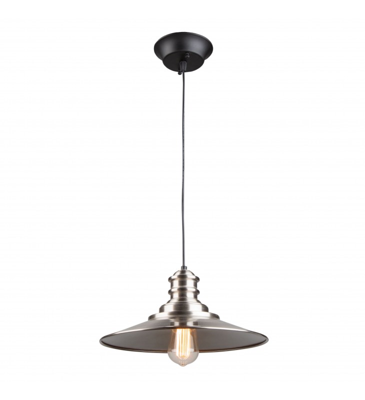 Made in North America with pride, this \"Broxton\" collection single pendant features a plated brushed nickel metal shade suspended on black wire with a black canopy.
