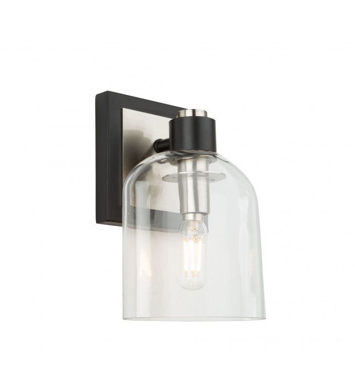 The \"Lydon Collection\" of bathroom vanities is slick and clean - a perfect compliment to any environment that is modern to transitional. The clear glassware has circular edges. The arms are finished in black while the accents are plated in nickel. Shown as a single sconce but also available in a 3 or 4 light version.