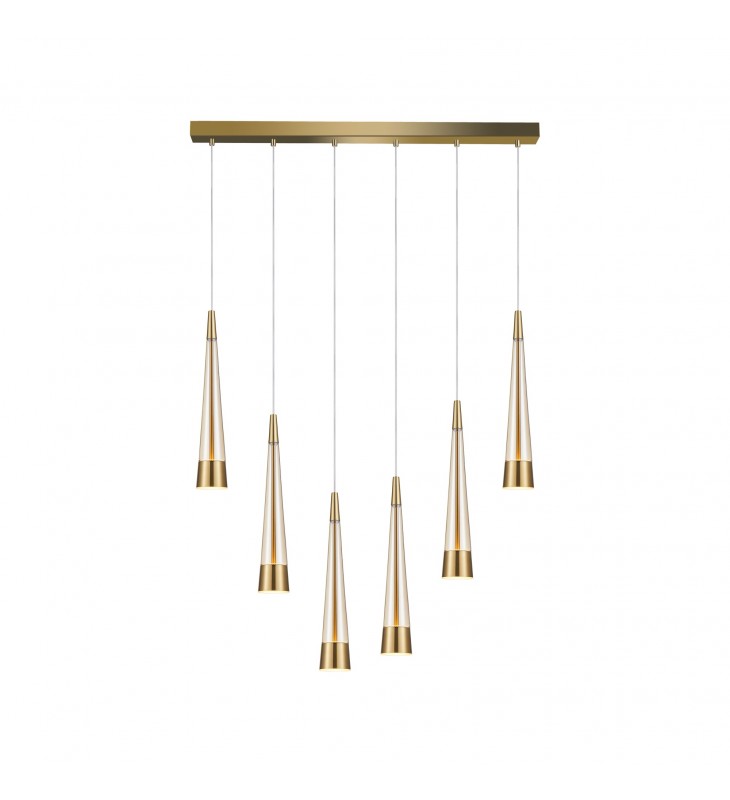 The Sunnyvale collection boasts a distinctive cone-shaped design adorned with metalwork on both the top and bottom, enveloping a captivating tea stain tinted center glass complimented with brushed brass framing. The pendant\'s exquisite craftsmanship and attention to detail result in a contemporary yet elegant aesthetic, making it a standout piece in any interior. With LED illumination seamlessly integrated throughout the glassware, the Sunnyvale collection not only delivers striking visual appeal but also provides efficient and ambient lighting. 6 light linear island chandelier model shown. (easily height adjustable)