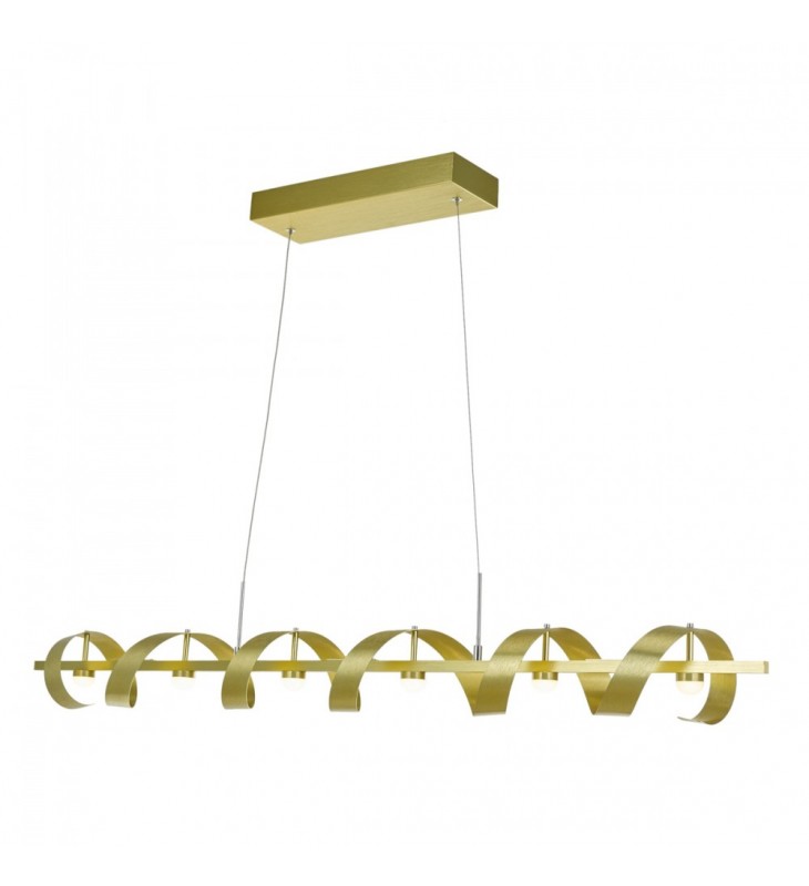 The \"Rolling Hills\" collection has bright LEDs, which bounce the light off the unique metal ribbons. This chandelier is suspended on aircraft cable which can be adjusted for different heights very easily. Shown in brushed brass - also available in aluminum color. Great for energy efficiency.\n \n \n \n