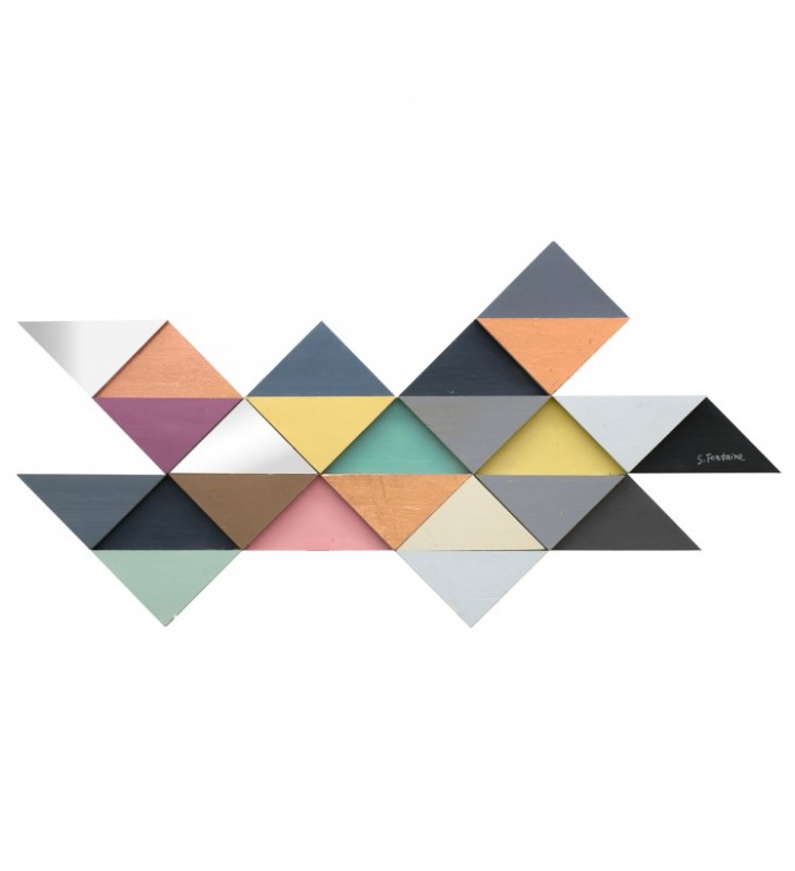 This modern mixed-medium wall art piece combines vibrant pastels with metallic and mirrored wedges. The triangles also vary in thickness, taking the geometric design to another dimension.