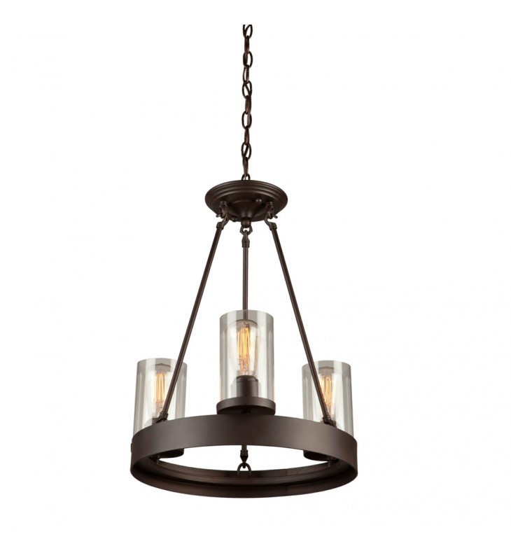 The Menlo Park Collection is painted in a dark chocolate finish, and complimented with a clear cylinder glass. Spherical clean lines throughout gives this collection the status of an instant classic. Shown with Edison filament bulbs to convey the retro look. Tri light mini chandelier\n \n \n \n